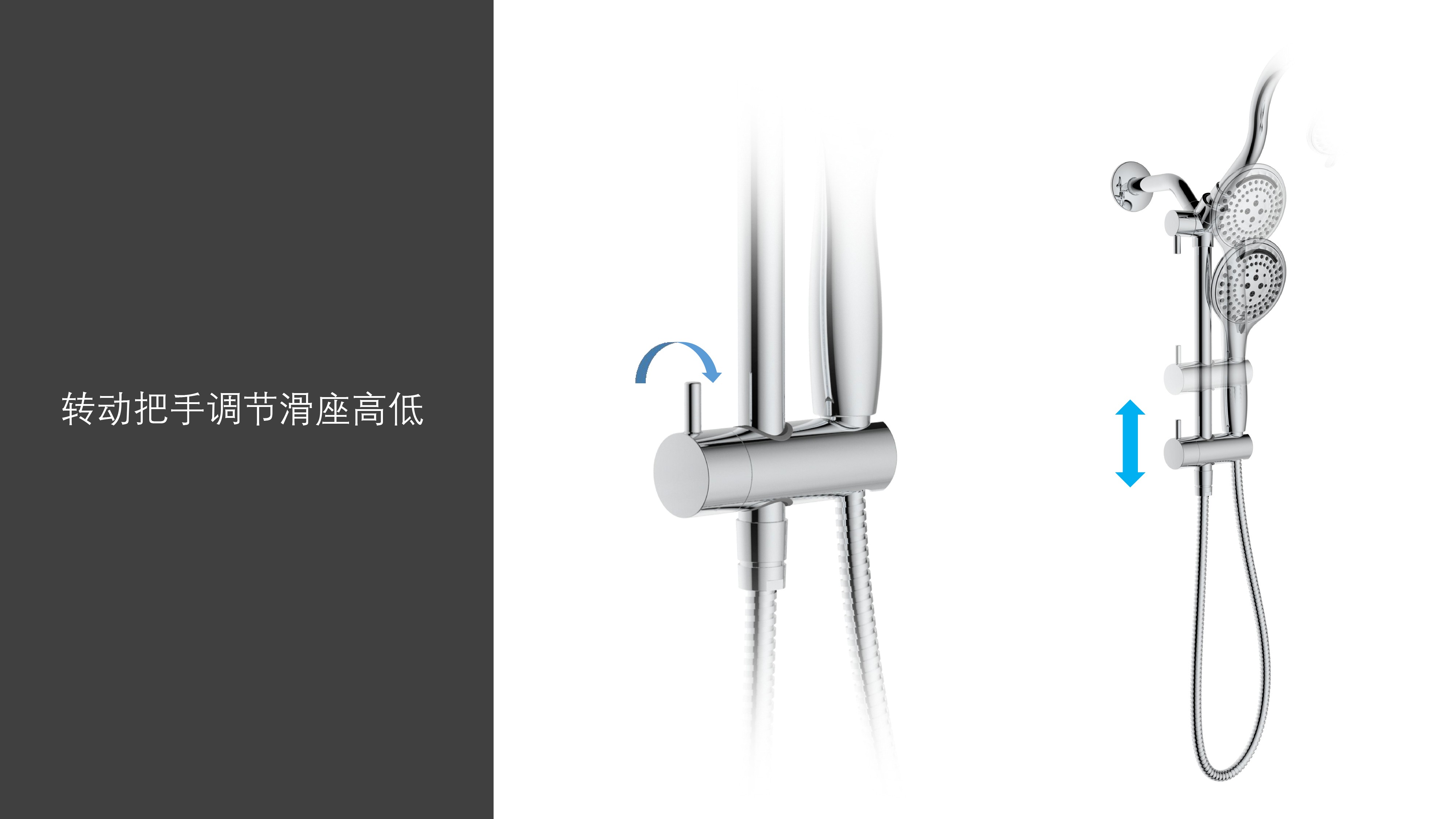 上出水彎管套裝;頂噴內(nèi)置球頭,可實(shí)現(xiàn)多角度旋轉(zhuǎn)調(diào)整;把手切換頂噴出水、花灑出水;轉(zhuǎn)動(dòng)把手調(diào)節(jié)滑座高低